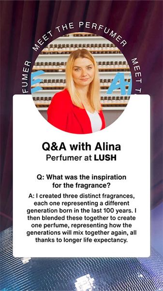 Alina was created by Lush perfumer of the same name, who was inspired by the generations of women that came before her. Alina created three distinct fragrances, each one representing a different generation born in the last 100 years, before blending them together to create a multi-layered and timeless scent. She named the fragrance Alina – a name given to her by her grandmother.
