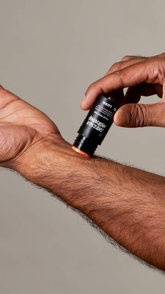 Push up gently, apply to your pulse points and massage in. Use your wrist to gently push the perfume back into its packaging.