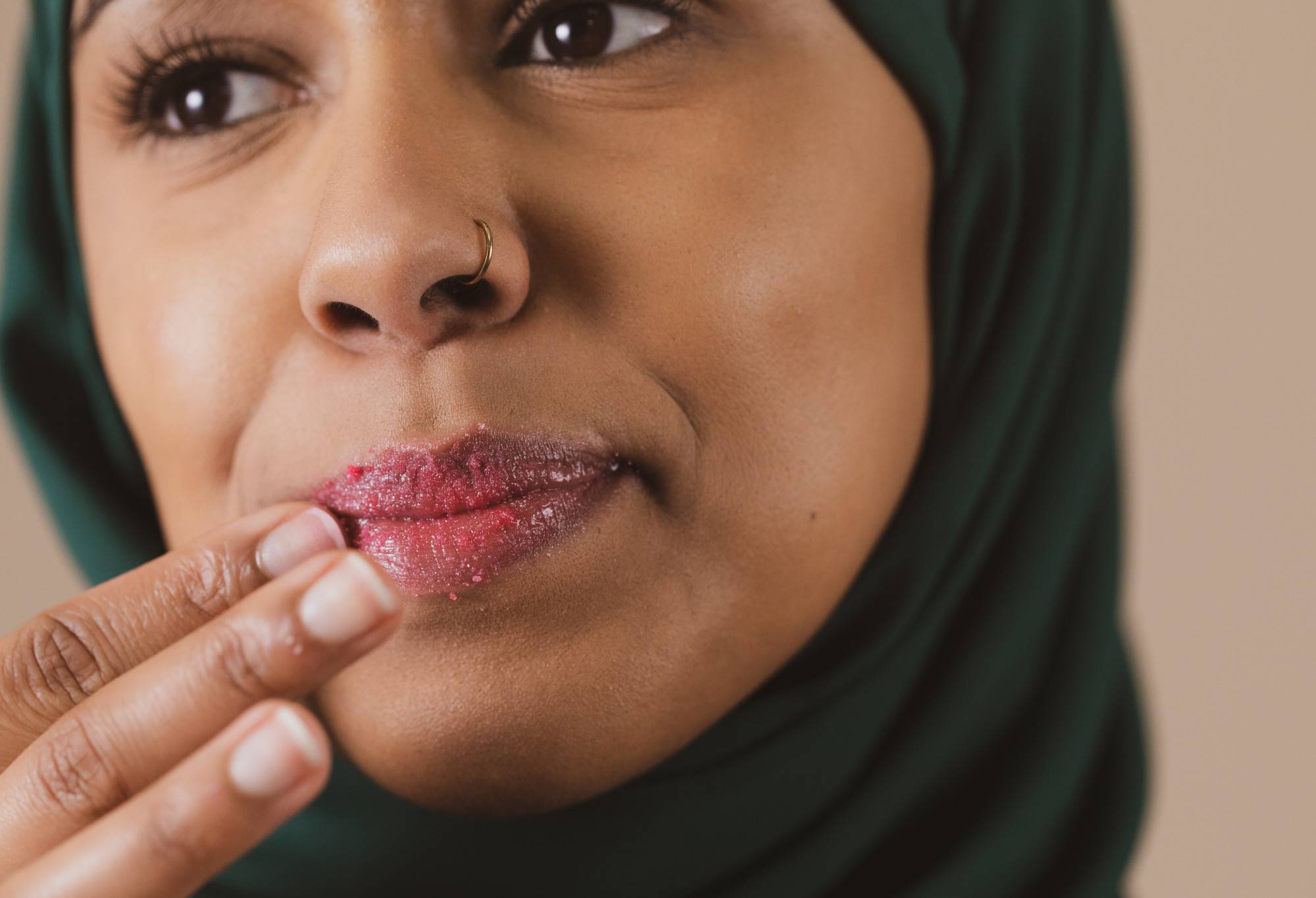 Take a small amount on the tip of your finger and gently work over your lips to soften and polish. Wipe any excess away for cherry-sweet chops.