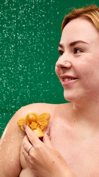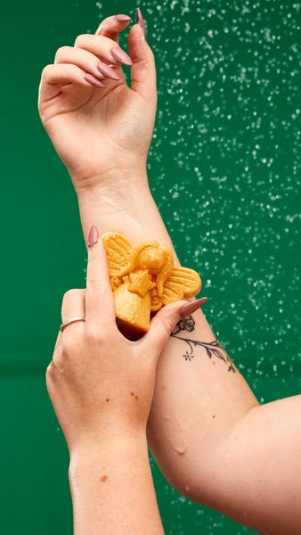 A golden angel graces your soap dish with juicy sweet scents, a touch of sparkle and soothing fine oatmeal. Your wish for soft, scented hands has been granted this Christmas.