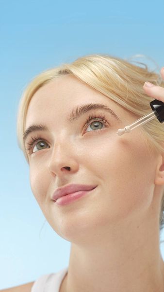 With your dropper, add a little dab under the eye, above the eye socket bone and under the eyebrows for a light, finishing touch after primer and foundation. A little will do — it goes a long way.