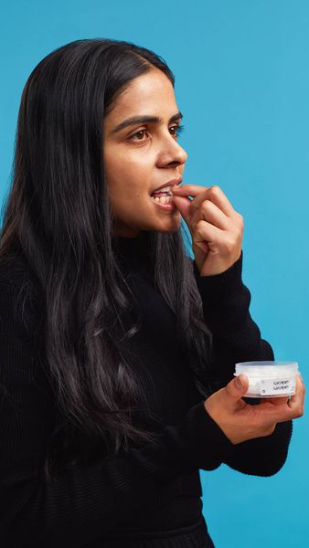 Pop one in your mouth neat with a sip of water. Nibble and crush the tab, swill around your mouth, then spit and rinse. Use fresh to guarantee the fizz and put the lid back on in between uses.